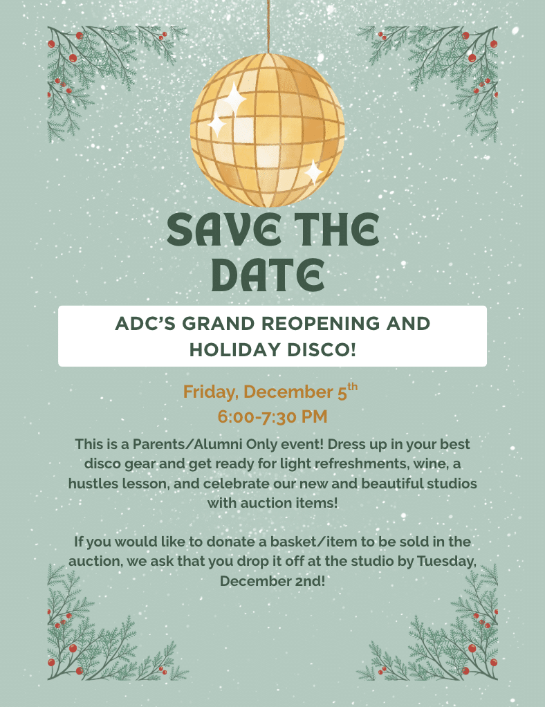 Join us for a Grand Reopening celebration of our newly renovated (and dry) studios. All ADC parents and alumni are welcome to dress up, mingle, enjoy food and wine, and join Jeremy and Charlotte for an exclusive hustle lesson.